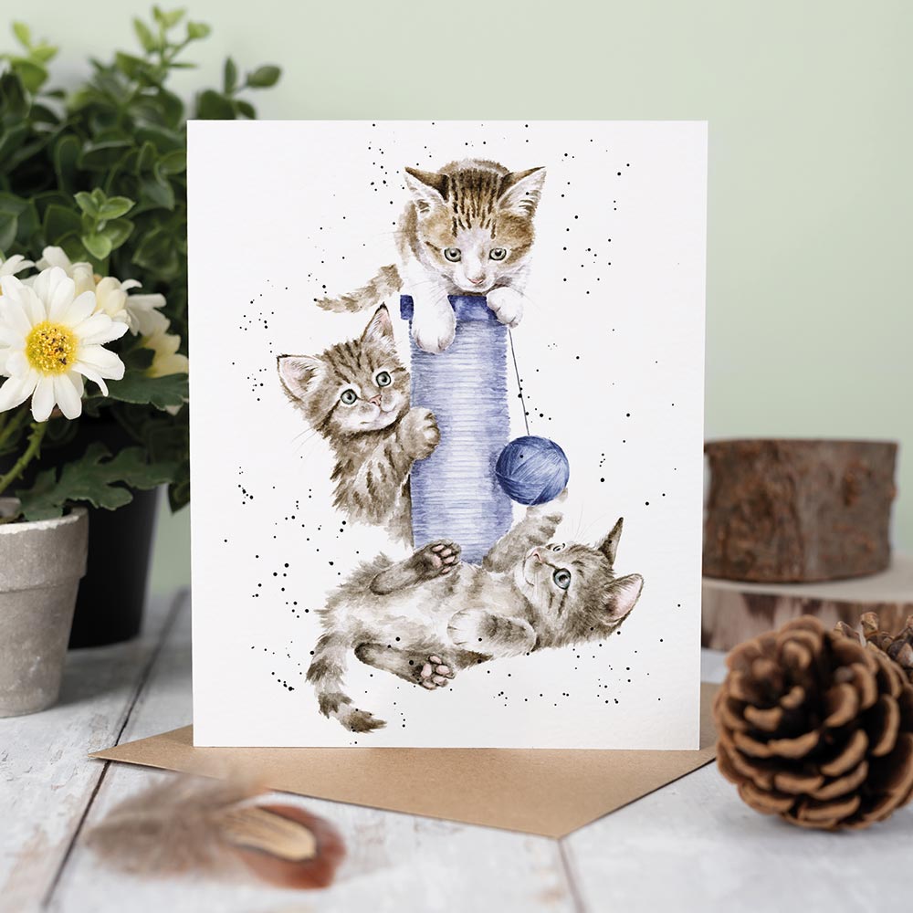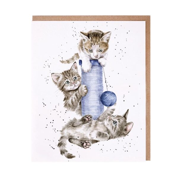 Biglietto d’auguri con busta in carta kraft riciclata con una bellissima illustrazione di tre gattini che giocano con un tiragraffi blu!! L’interno del biglietto è completamente bianco, rendendolo perfetto e personalizzabile davvero per qualsiasi occasione!!