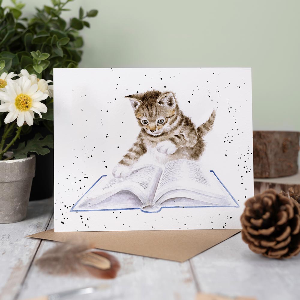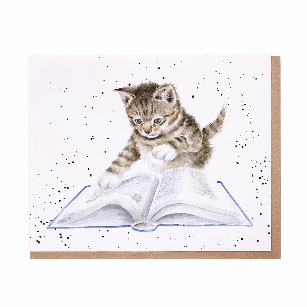 Biglietto d’auguri con busta in carta kraft riciclata con una bellissima illustrazione di un gattino studioso che legge un libro!! L’interno del biglietto è completamente bianco, rendendolo perfetto e personalizzabile davvero per qualsiasi occasione!!