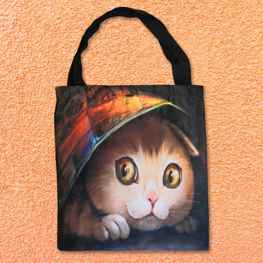 Borsa shopper classica monotasca in tessuto leggero con una simpatica illustrazione di un gattino rosso curioso… chissà cosa sta cercando!!