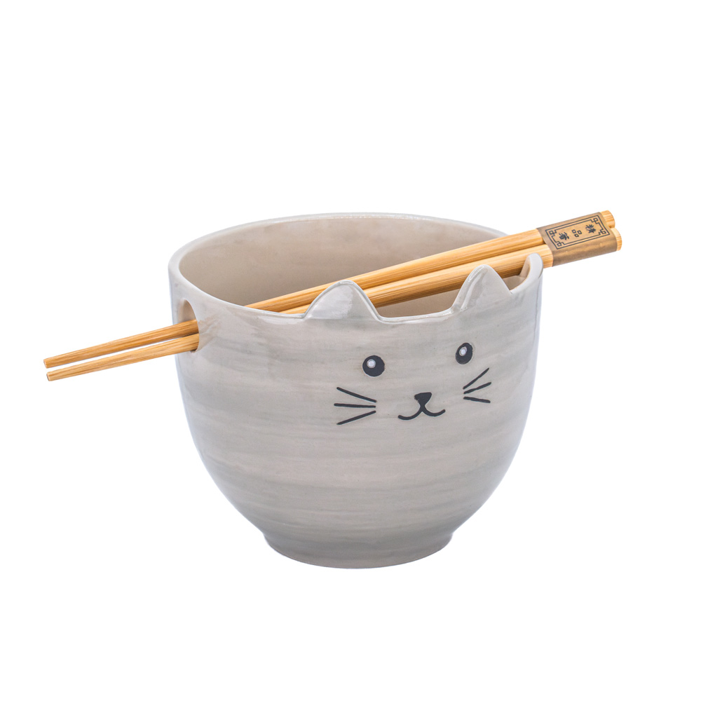 Ciotola in ceramica grigia con bacchette tipiche orientali a forma di musetto di gatto grigio! La ciotolina ha un piccolo foro sul bordo apposta per infilare le bacchette in maniera pratica ed efficiente, evitando di appoggiarle sul tavolo e sporcarle.
