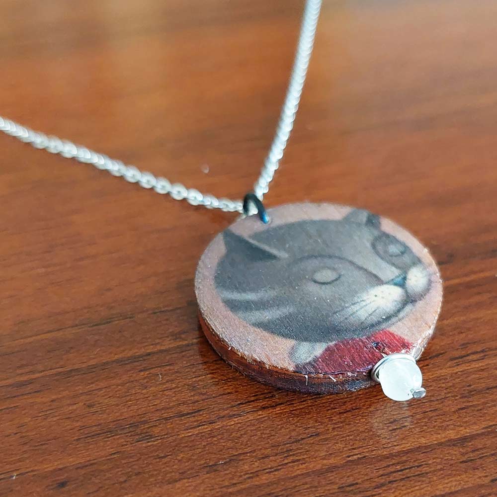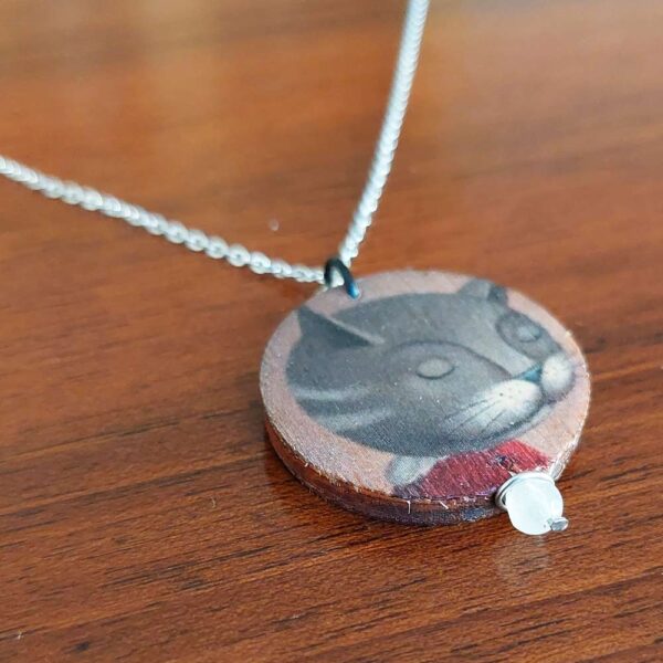 Collana con ciondolo in legno artigianale con una bellissima decorazione di un musetto di gatto grigio sornione!!