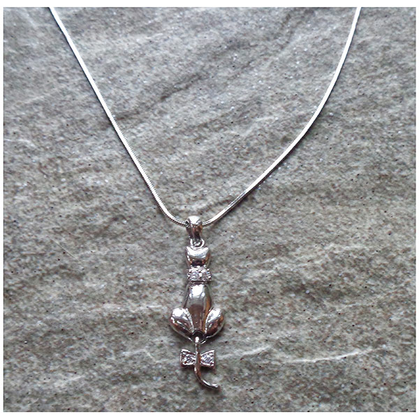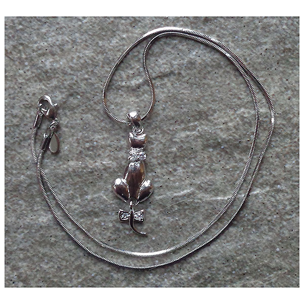 Collana con ciondolo a forma di gatto, codina mobile. In ottone rodiato e brillantini Swarowsky.