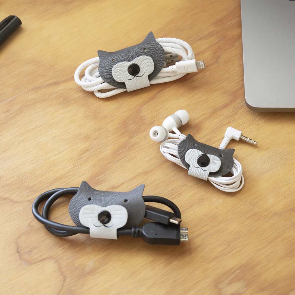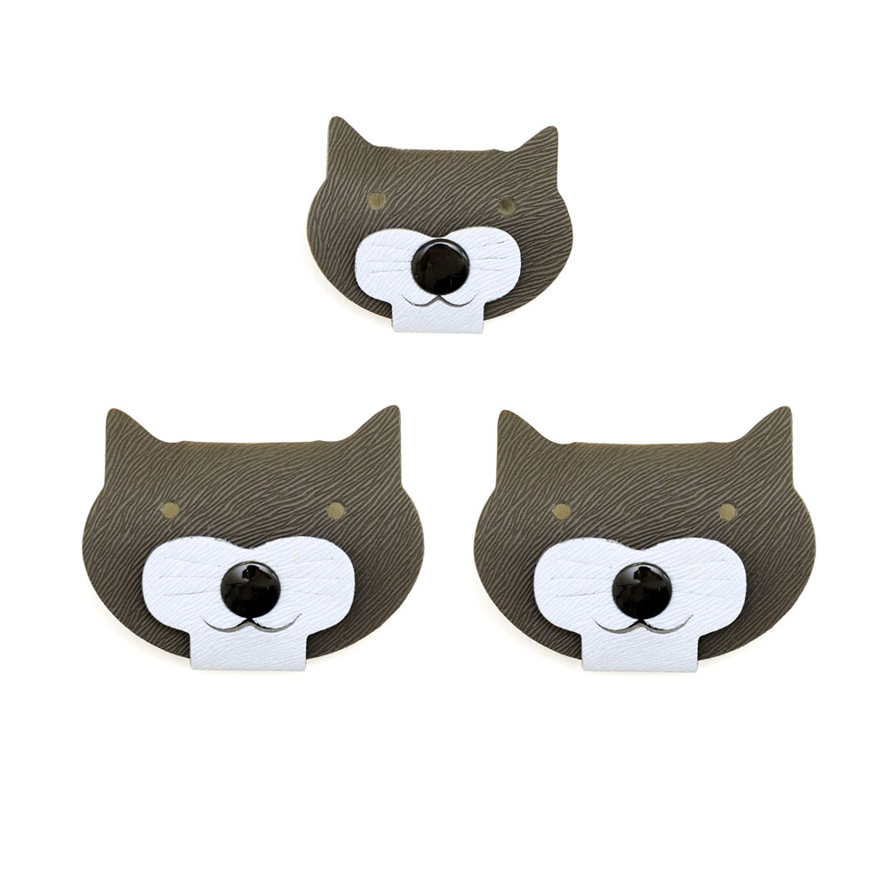 Set di 3 fascette portacavi a forma di musetti di gatti grigi e bianchi, 2 grandi e 1 un po’ più piccolo, utilissimi per tenere bene in ordine cuffie e cavi di alimentazione senza che si formino quei fastidiosissimi e indistricabili nodi!!