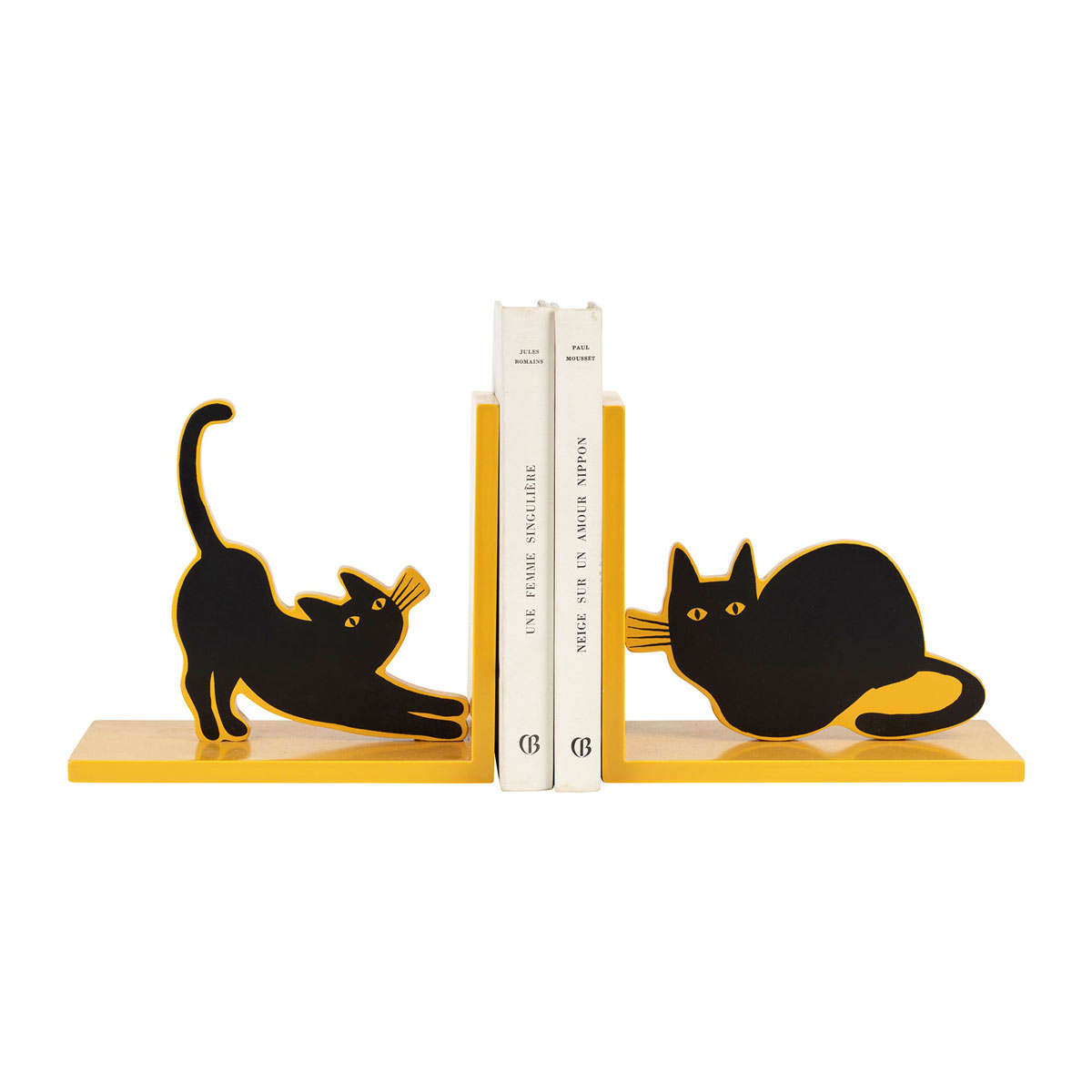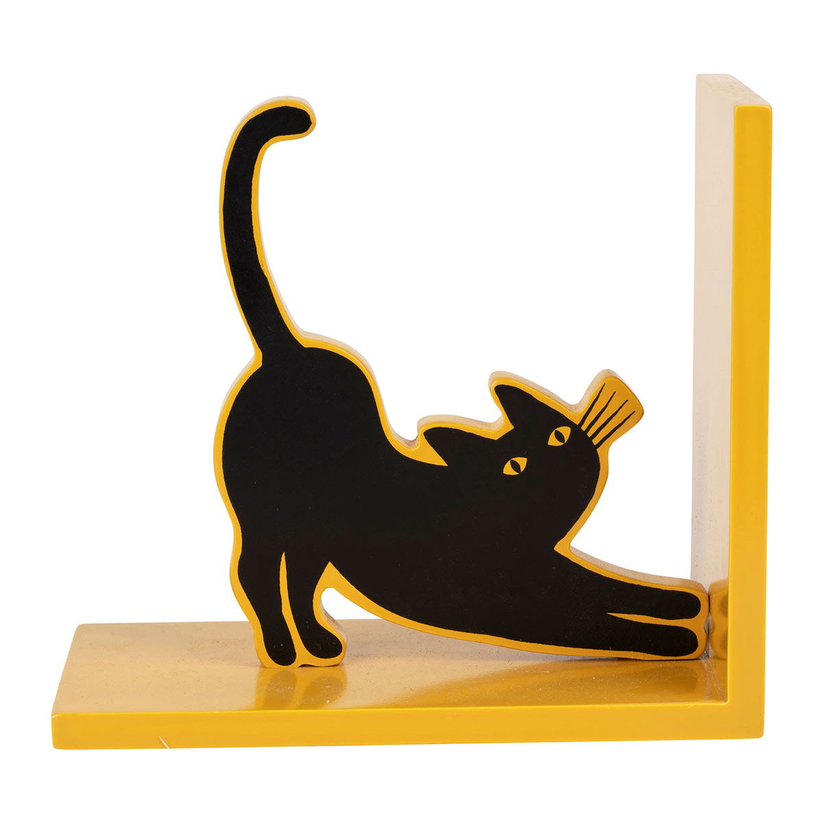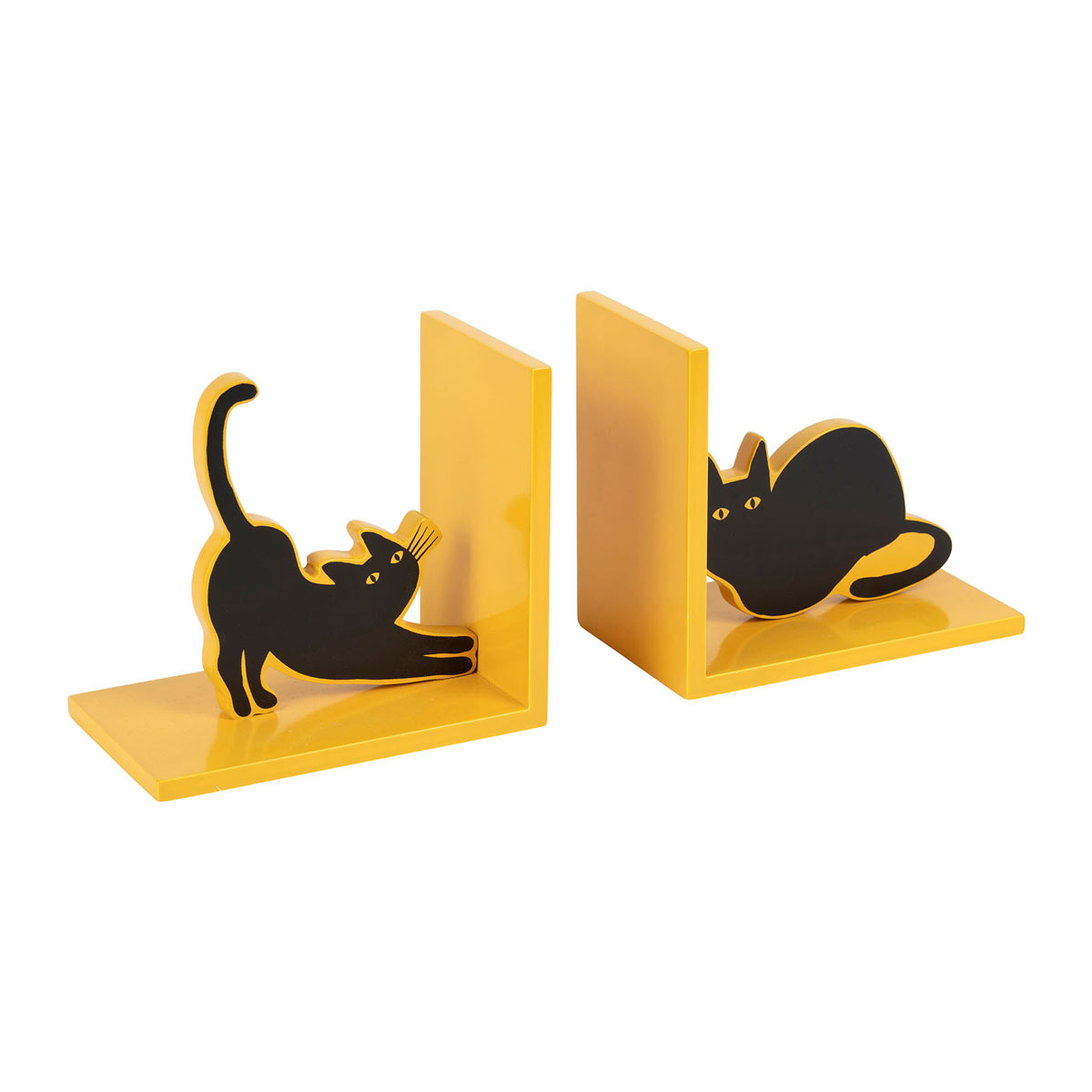 Fermalibri in due pezzi gialli in legno con due gatti neri, uno che si stiracchia e uno accoccolato!! Ideali per un ambiente colorato e… gattoso!!