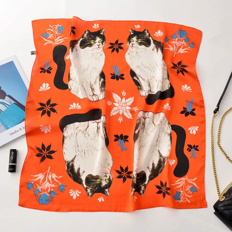 Foulard arancione in morbidissimo poliestere effetto seta con una bellissima illustrazione di gatti bianchi e neri, fiori e foglie!! L’ideale per la stagione primaverile o autunnale per ripararsi dal vento in modo… gattoso!!