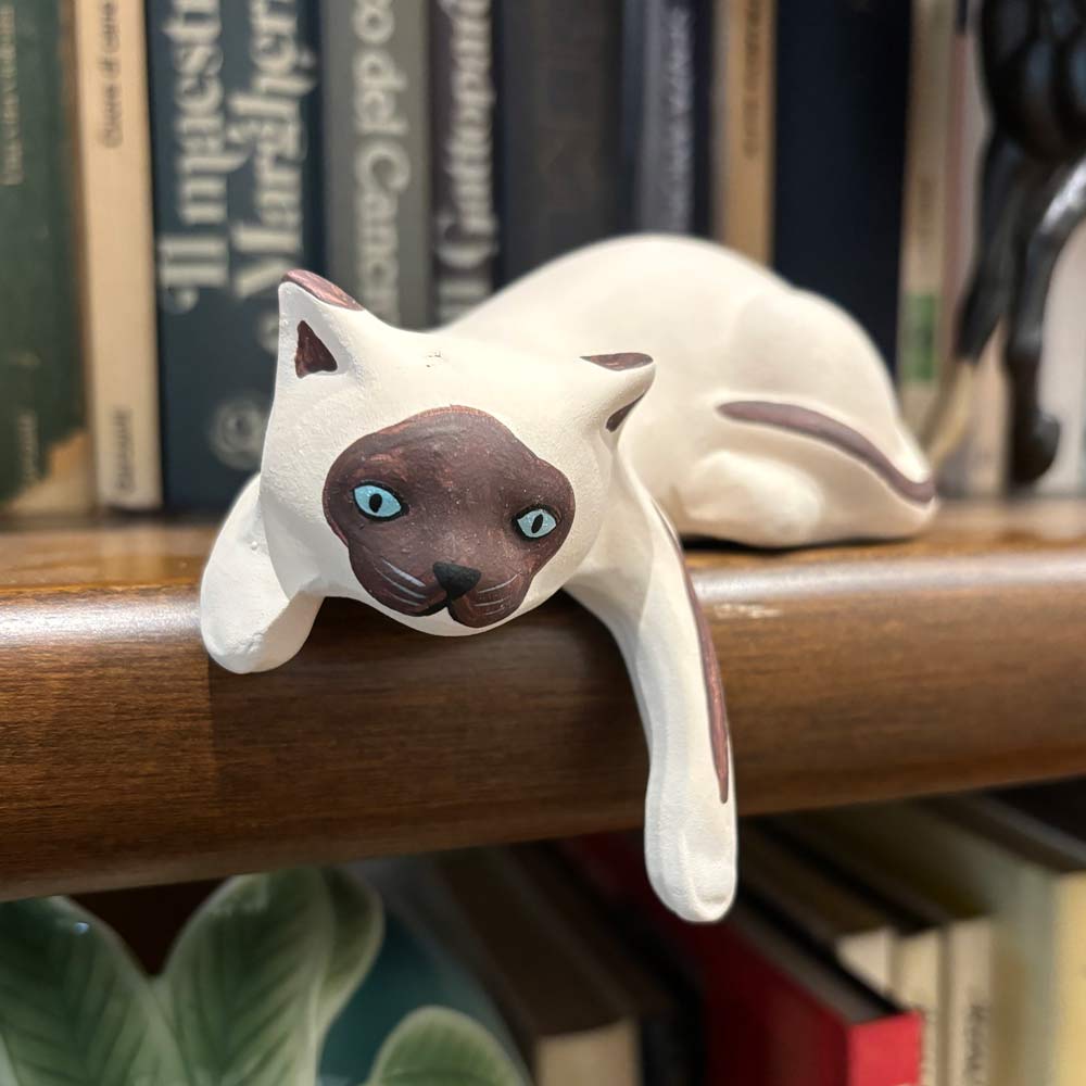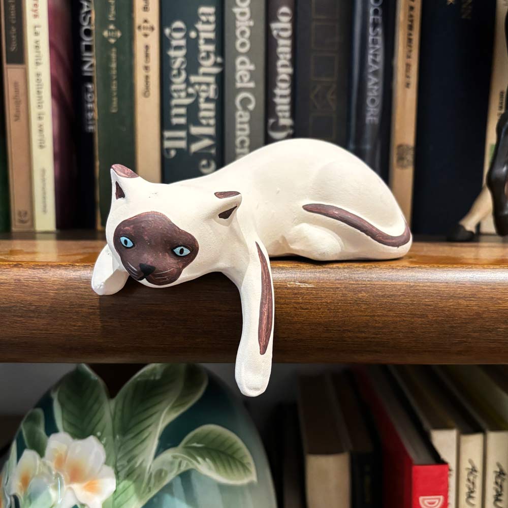 Gattino in ceramica siamese, completamente fatto e dipinto a mano in Italia, sdraiato a rilassarsi con una zampetta a penzoloni!! Perfetto per decorare qualunque ambiente interno o esterno e portare tanta gattastica allegria!!