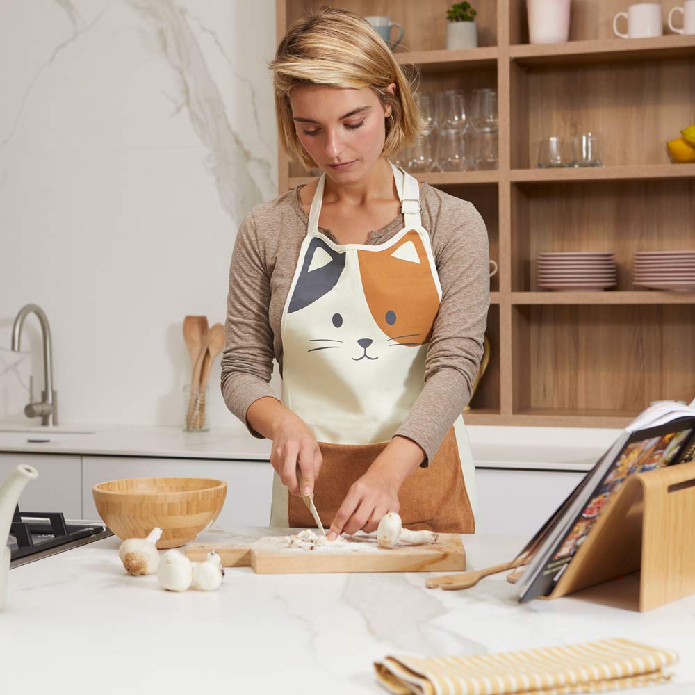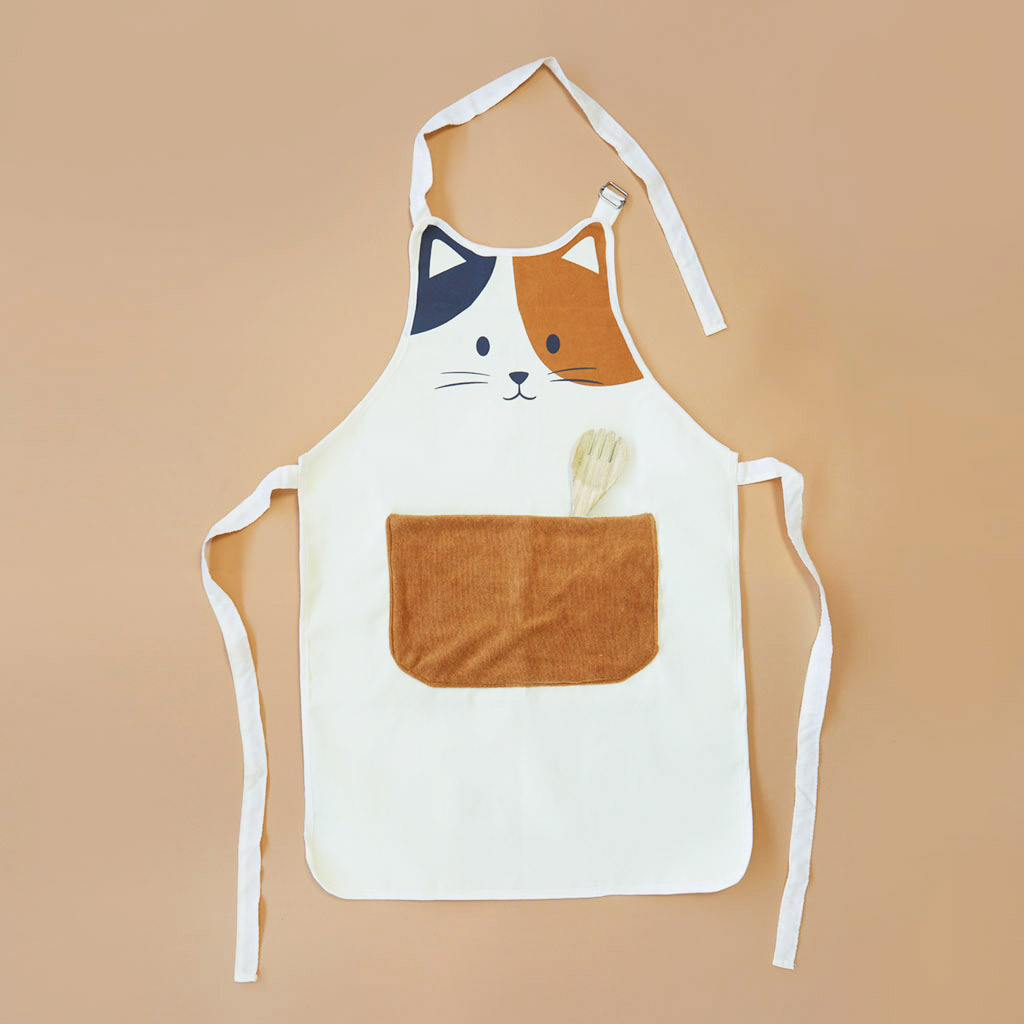 Simpaticissimo grembiule da cucina a forma di gattino pezzato bianco, nero e marroncino!! Ha anche una tasca in microfibra perfetta per asciugarsi le mani e riporre utensili da cucina in un battibaleno!!