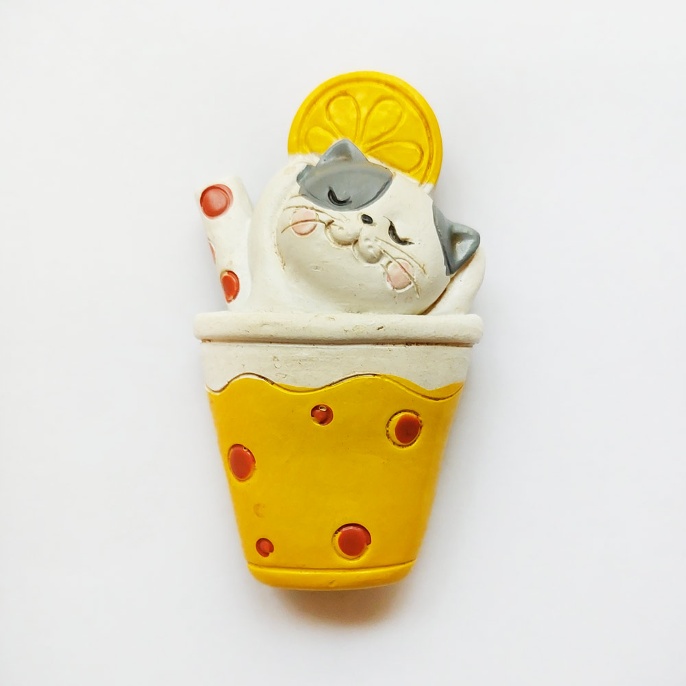 Magnete in resina dipinta a forma di gattino che si rilassa felice in un bicchiere di fresca limonata, perfetto per decorare il frigo!!