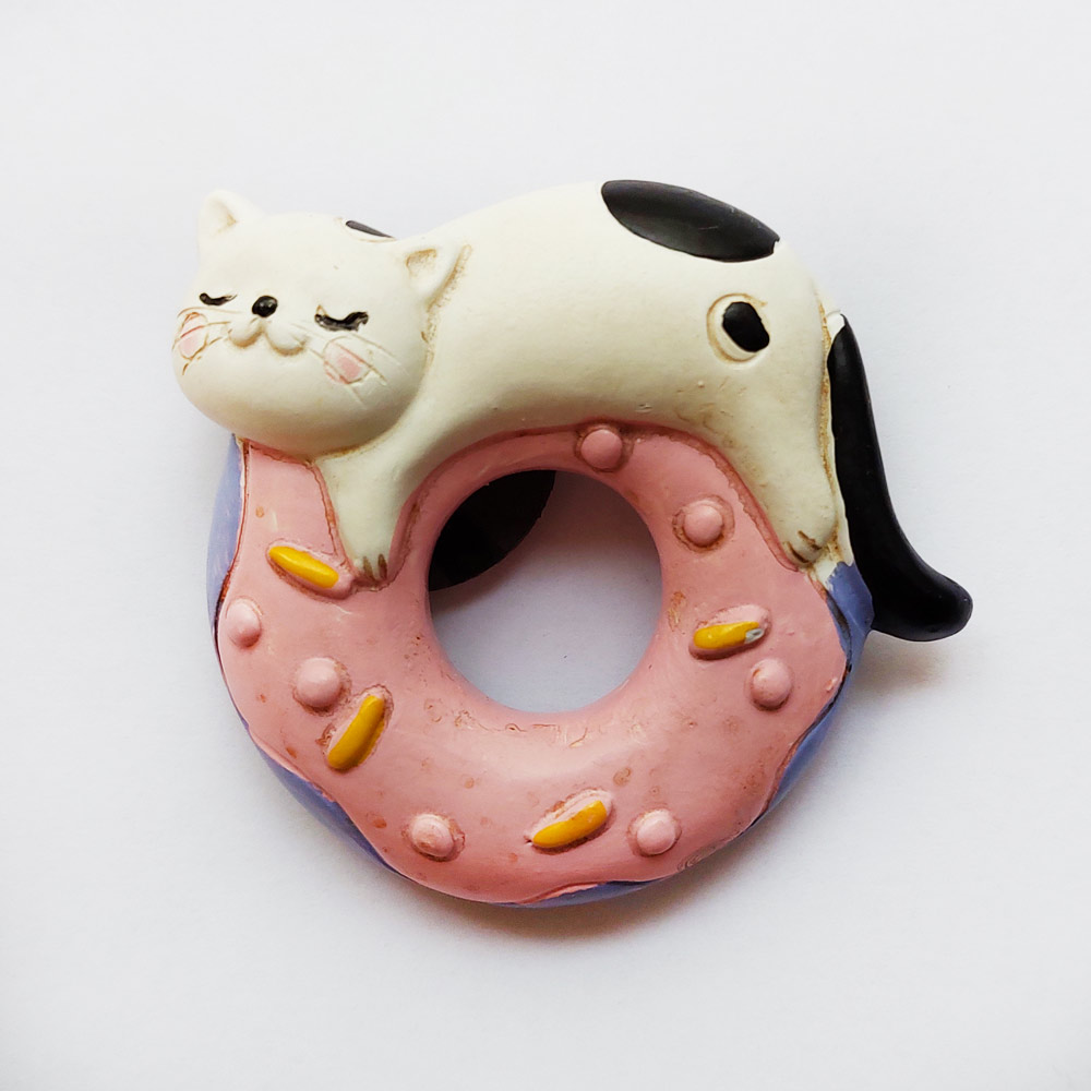 Magnete in resina dipinta a forma di gatto sdraiato su di una deliziosa ciambella, perfetto per decorare il frigo!!