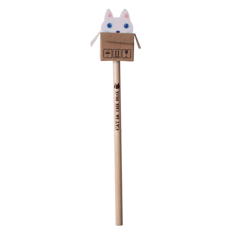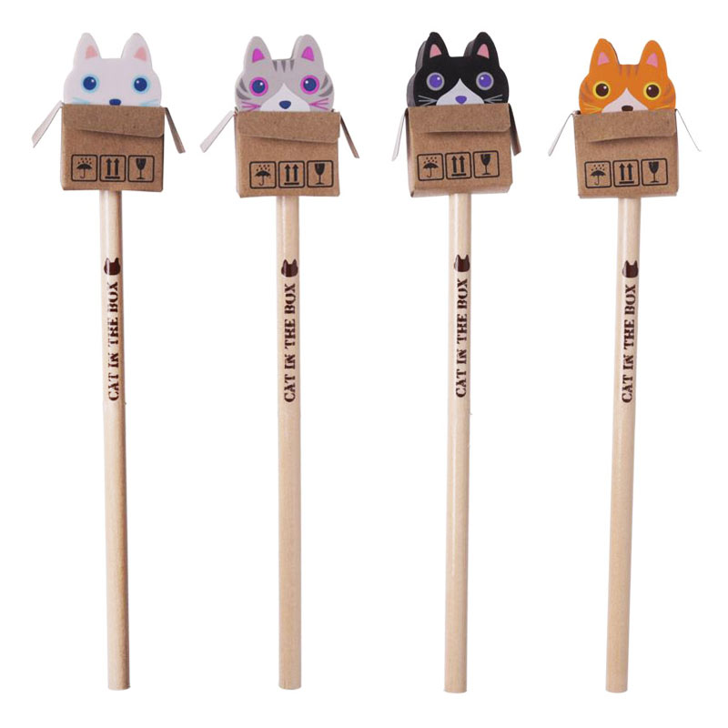 Classiche matite grafite con gomma colorata in cima a forma di gattini nascosti dentro un pacco postale.