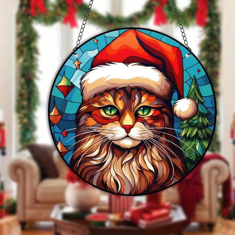 Grande medaglione decorativo da appendere stile vetrata con un gatto che indossa il tipico cappello natalizio!! Da appendere dove vuoi, ma renderà al meglio alla finestra!!