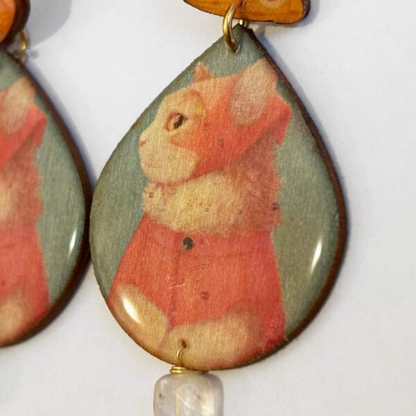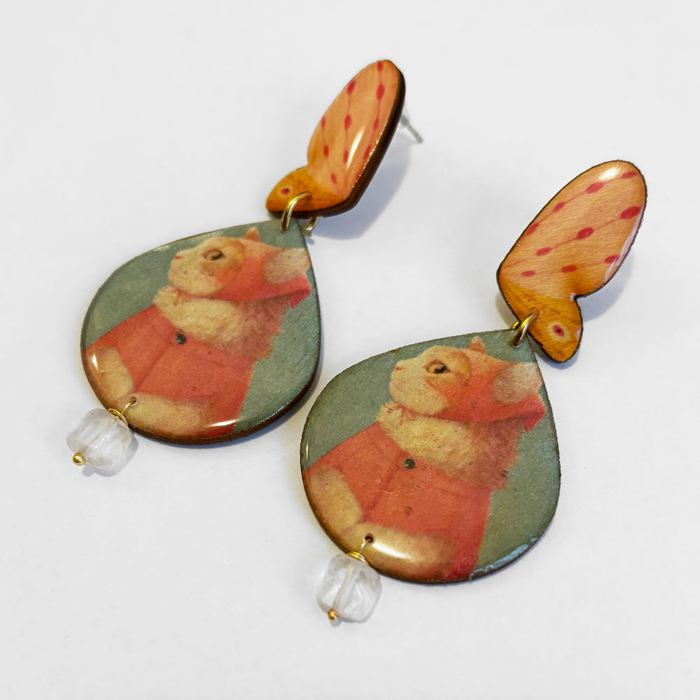 Orecchini a pendente a goccia in legno di tiglio resinato e smaltato con una bellissima illustrazione di un gatto nobile medievale!! Il pendente è a sua volta appeso ad una piccola farfalla, anch’essa in legno smaltato.
