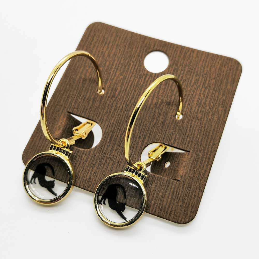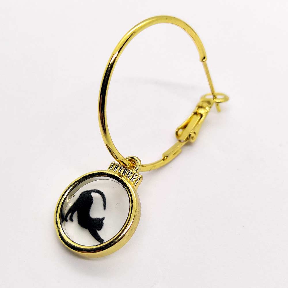 Orecchini ad anello dorati con pendente medaglietta trasparente con una silhouette di un gatto nero che si stiracchia.