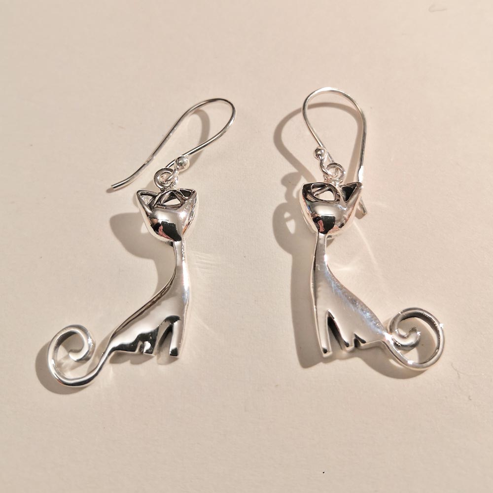 Orecchini in argento a forma gatti stilizzati dalla forma molto sinuosa.