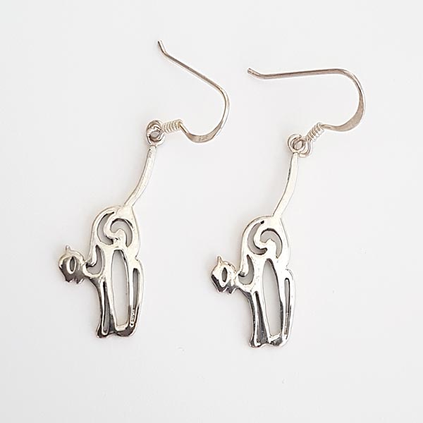 Orecchini in argento con amo a forma di gatto che fa la gobba; per orecchie con buchi.
