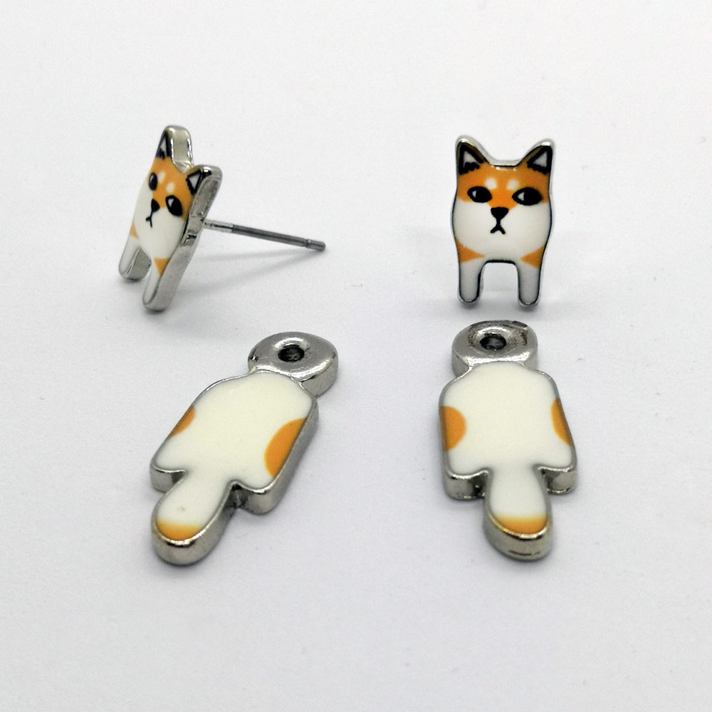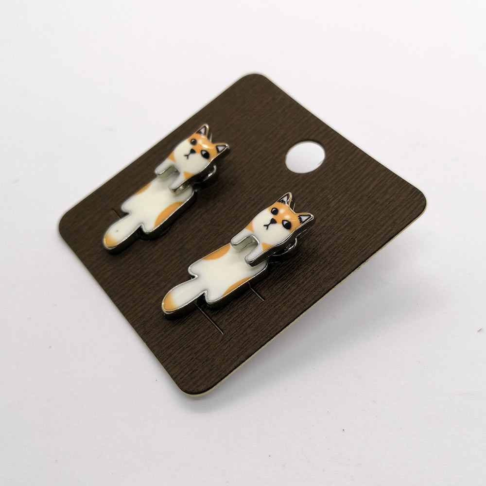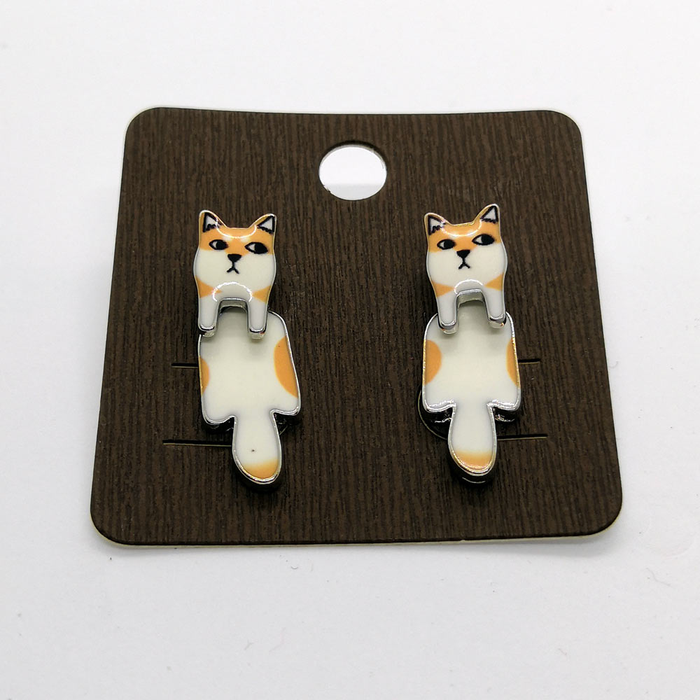 Orecchini “componibili” a forma di gatto rosso e bianco. Il musetto sta al di sopra del lobo dell’orecchio, mentre il corpo rimane dietro formando un bell’effetto 3D!