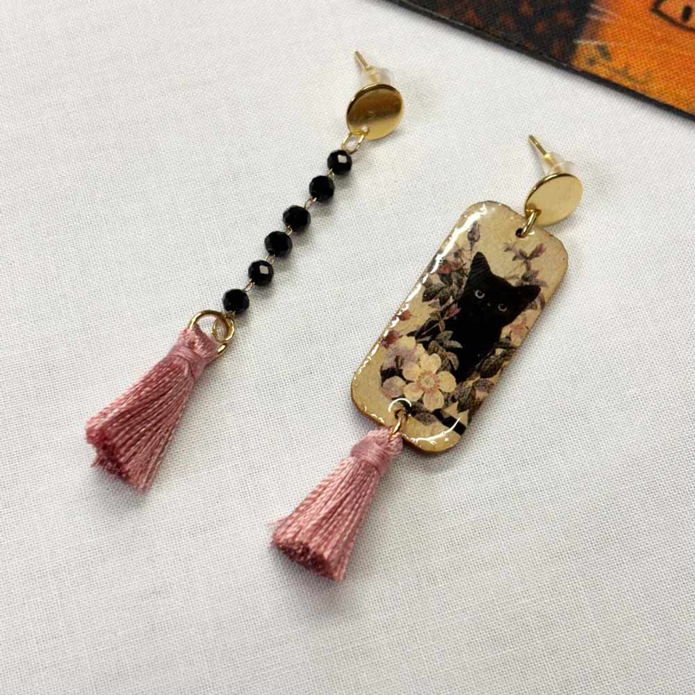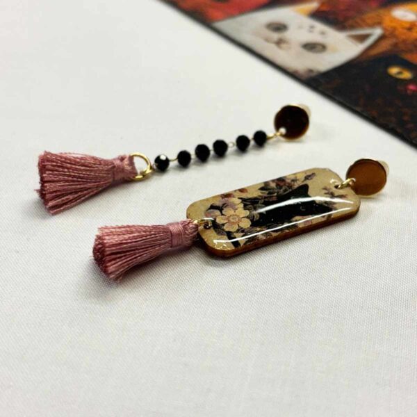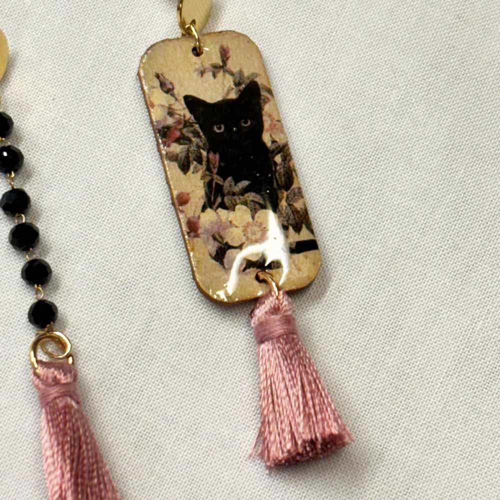 Orecchini a pendente artigianali in metallo placcato oro 18KT e legno di tiglio resinato decorati con una bellissima illustrazione di un gattino nero seduto fra i fiori e con pietre dure e nappine!!