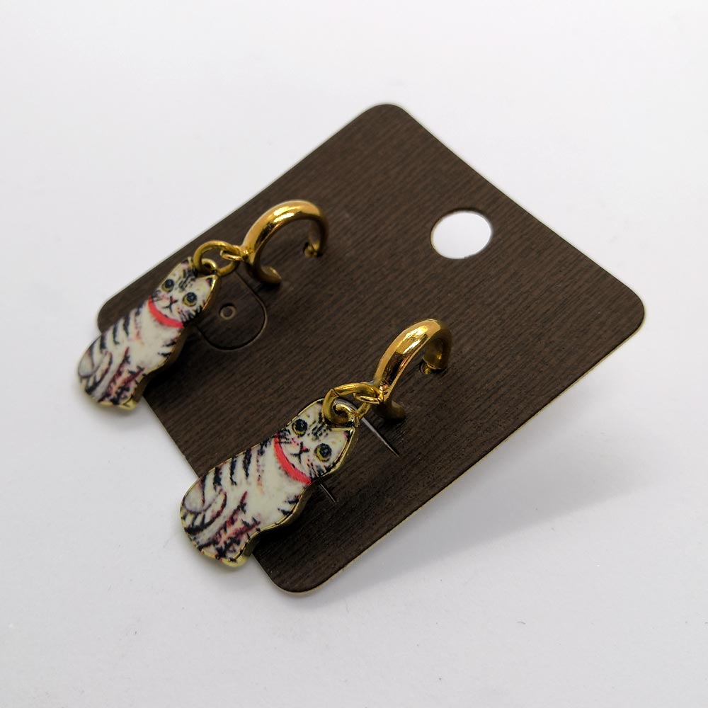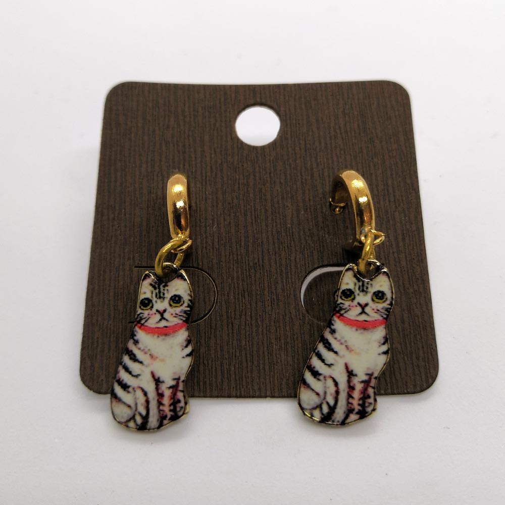 Orecchini a perno dorati con pendente a forma di gattina tigrata con un collarino rosa.