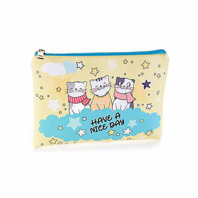 Pochette in similpelle con chiusura a zip decorate con tanti simpaticissimi e divertentissimi disegni di gatti e gattini!! Ce n’è davvero per tutti i gusti: con dolci, con cappelli, che saltano… un soggetto più bello dell’altro!!