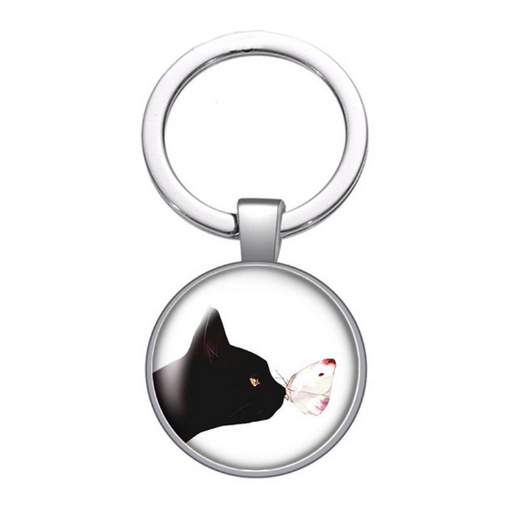 Piccolo portachiavi in metallo decorato con una bellissima illustrazione di un gatto nero con una farfalla sul naso!!