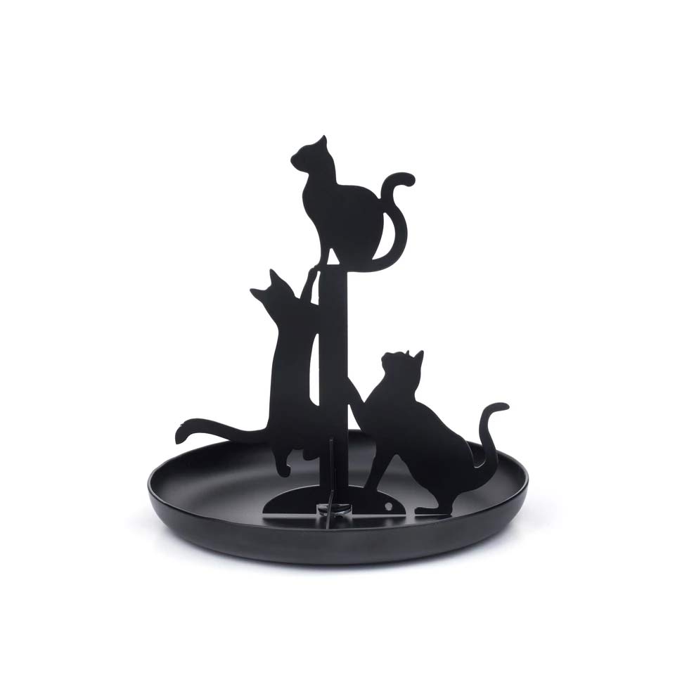 Portagioie in metallo nero opaco con tre gatti che ci si arrampicano sopra, sobrio ed elegante il suo colore mette in risalto la brillantezza dei gioielli!!