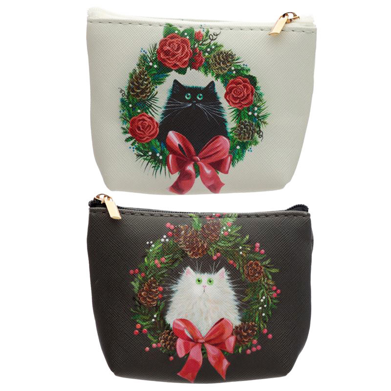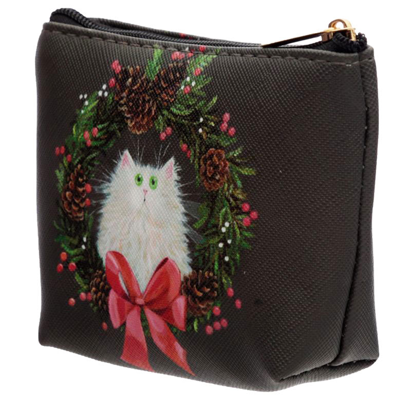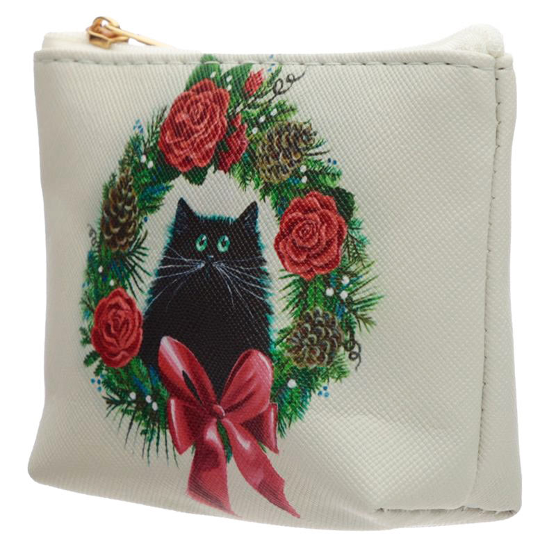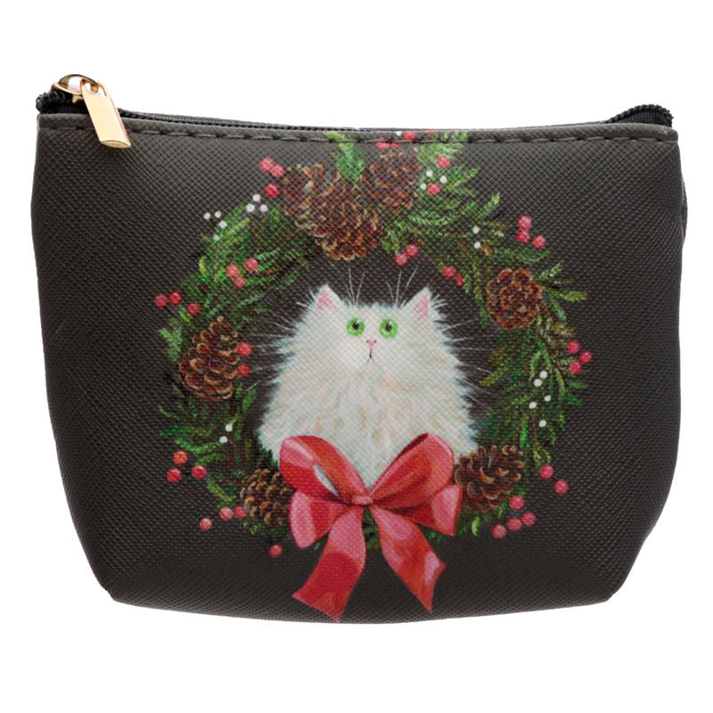 Portamonete natalizio con chiusura a zip decorato con una ghirlanda fesiva e un musetto di gatto disegnato da Kim Haskins!!