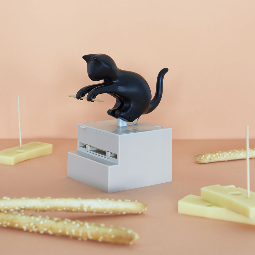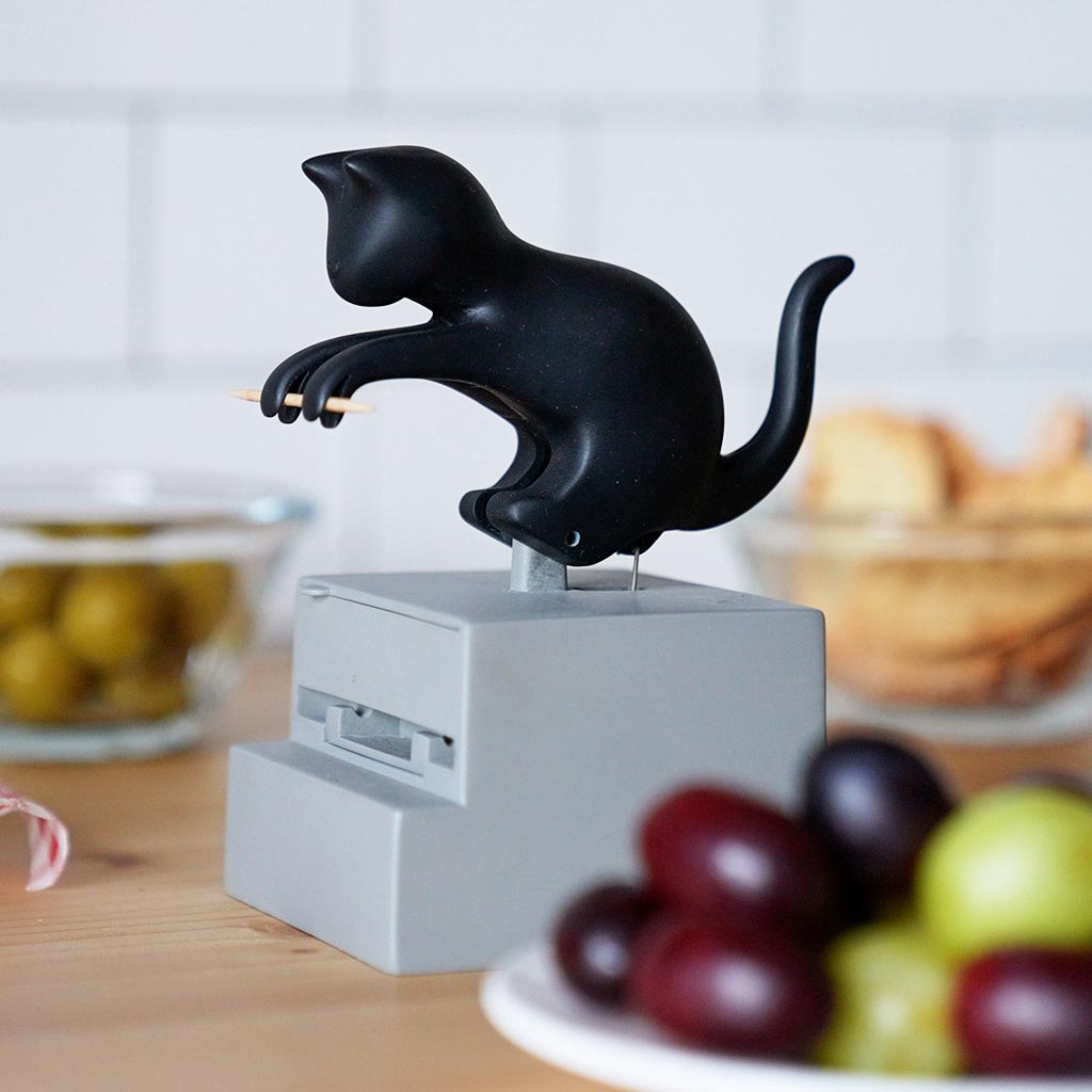 Portastuzzicadenti meccanico con gattino nero curioso che prende gli stuzzicadenti fra le zampe e te li porge!! Design davvero unico e simpaticissimo, e in più facilissimo da utilizzare: basta premere la testa del micio fino a quando le zampette toccano lo stuzzicadente, rilasciare e il gattino si rialzerà automaticamente!!