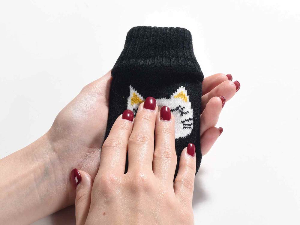 Scaldamani con copertura in maglia decorata con un musetto di gatto felice, perfetto per quando non si ha un gatto in braccio a tenerci caldi durante l’inverno!!
