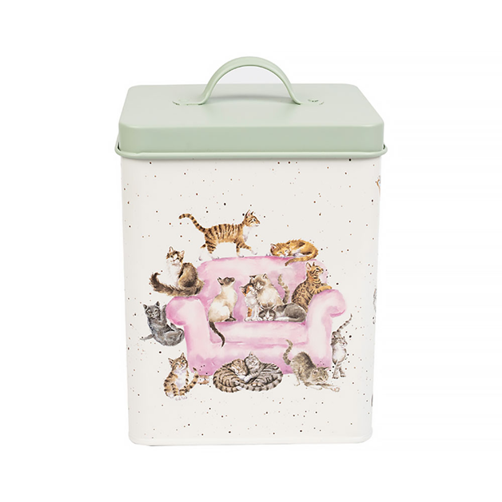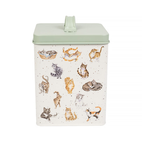 Scatola di latta color crema e verde pastello decorata con tante, bellissime illustrazioni di gatti e gattini, uno diverso dall’altro!! Sul fronte della scatola c’è un’illustrazione più grande di mici e micetti che giocano e si rilassano un divano dall’aria davvero comoda!