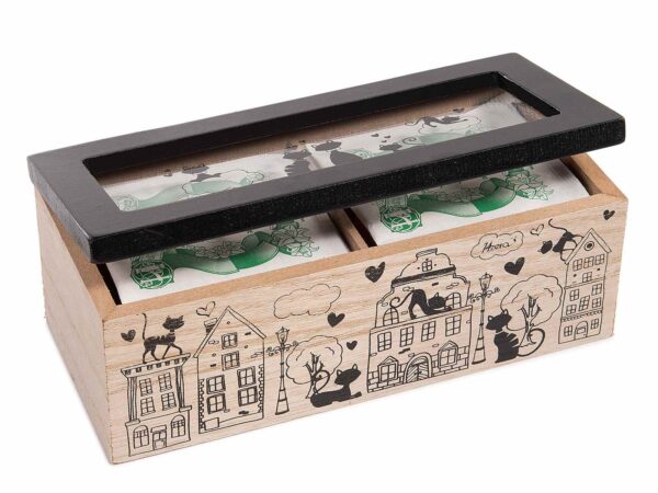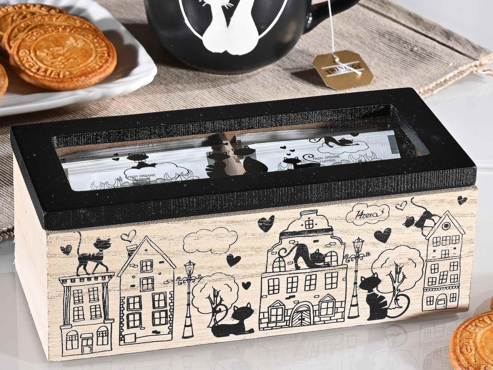Scatoletta in legno per conservare bustine di tè e spezie decorata con gatti