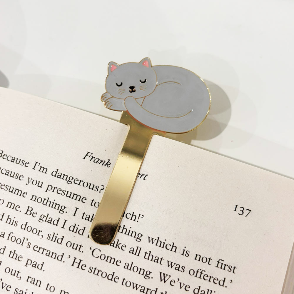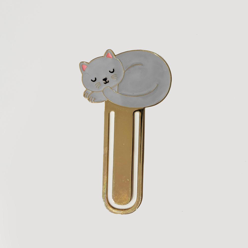 Segnalibro in metallo a clip decorato con un bel gattino grigio addormentato felice e sereno! Il perfetto compagno di lettura di ogni cat lover che si rispetti!