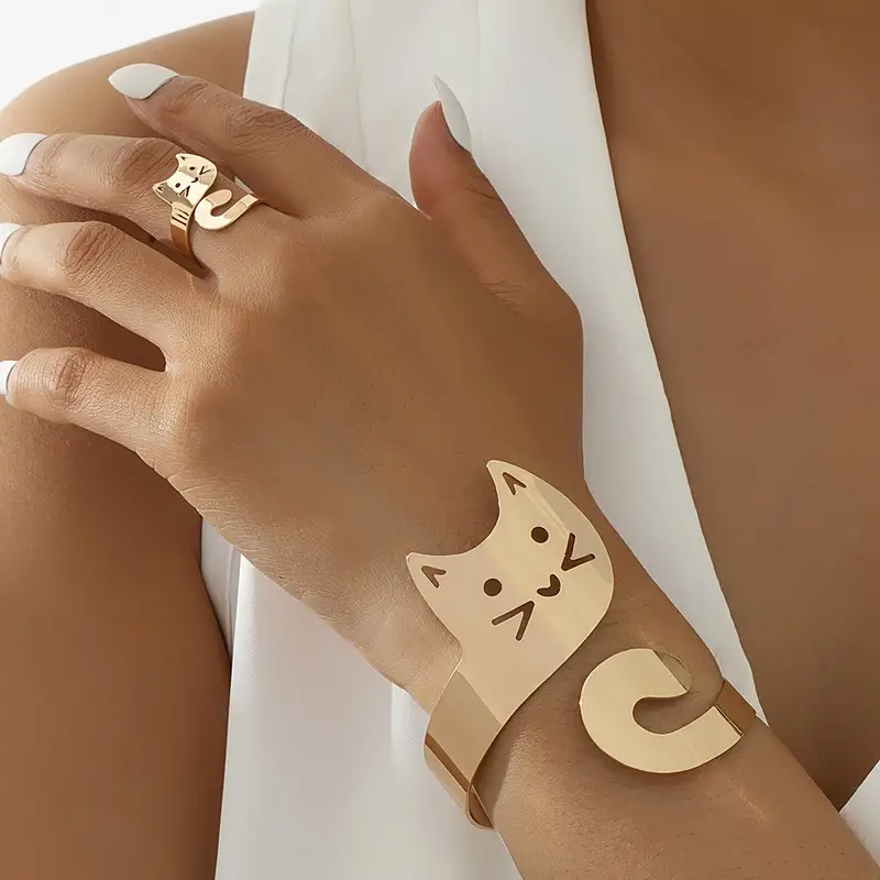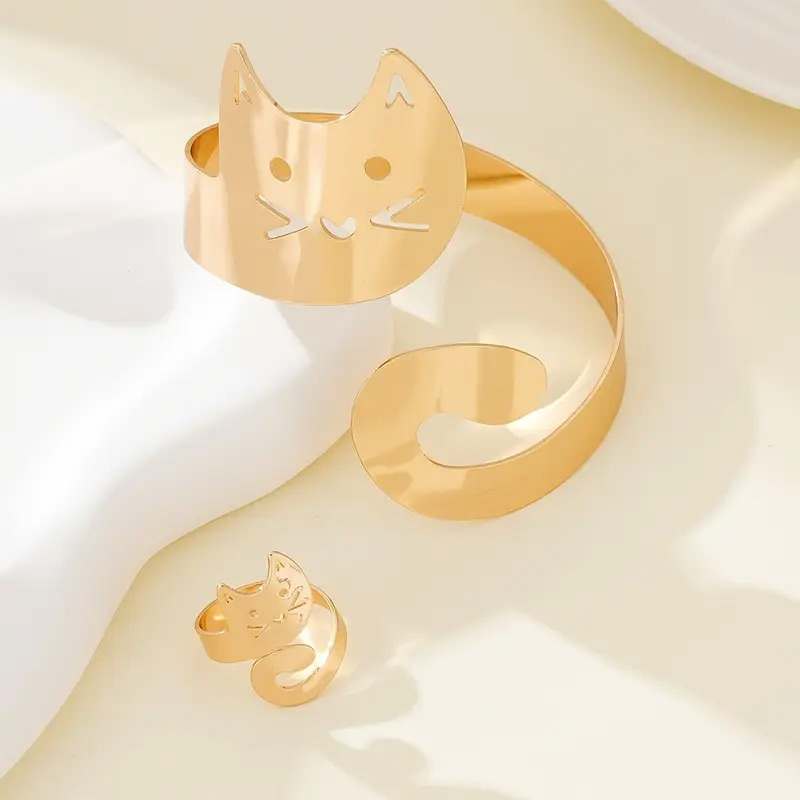 Set di bracciale e anello in metallo a forma di gatto che si arrotola intorno al braccio e al dito!! Essendo regolabili, si adattano a tutte le misure.