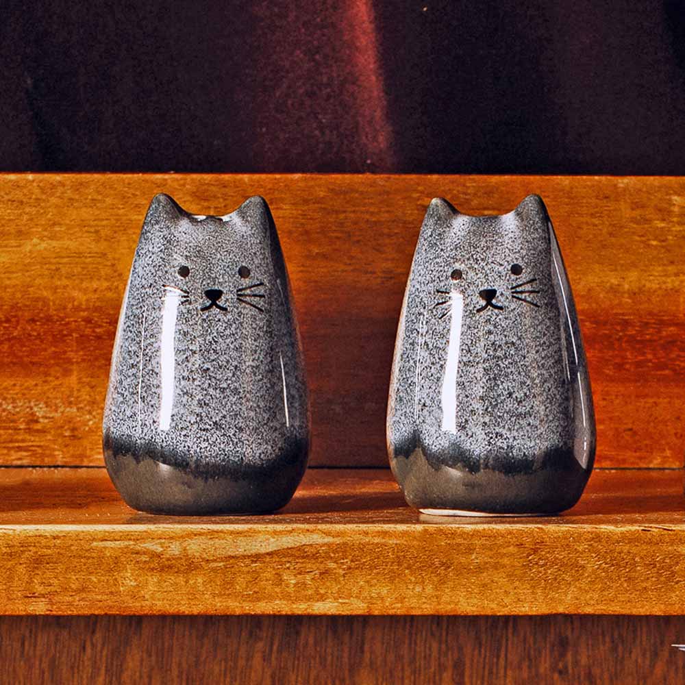 Set di sale e pepe in ceramica color granito scuro lucido e glossy a forma di gattini! Per portare un tocco gattoso e felino anche sulla tavola!
