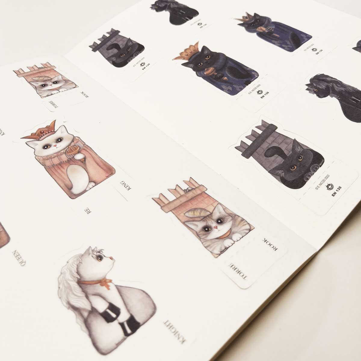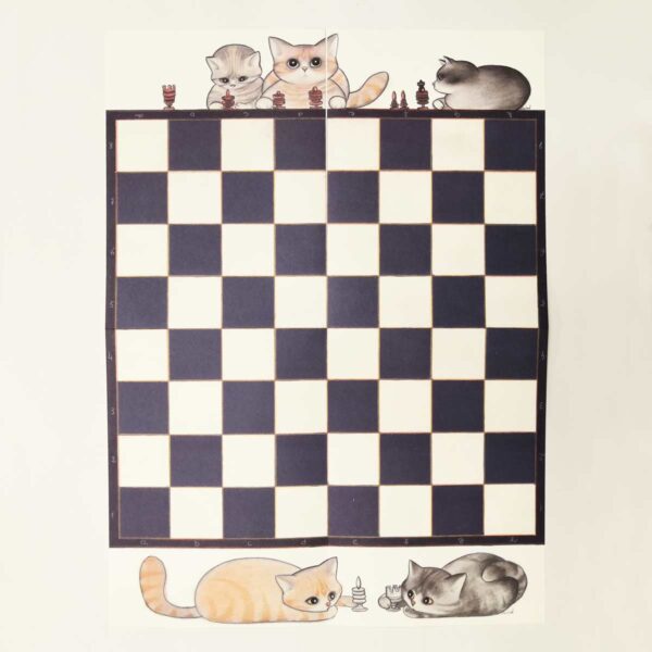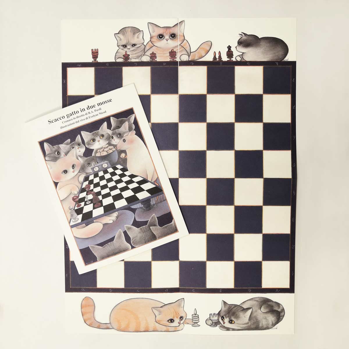 Set di scacchi e scacchiera “Scacco Gatto” di carta con i gatti della Gatteria disegnati da Evelyne Nicod!!
