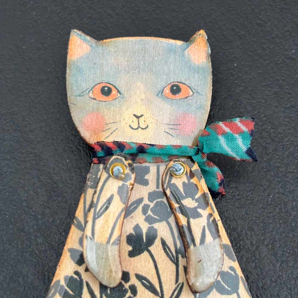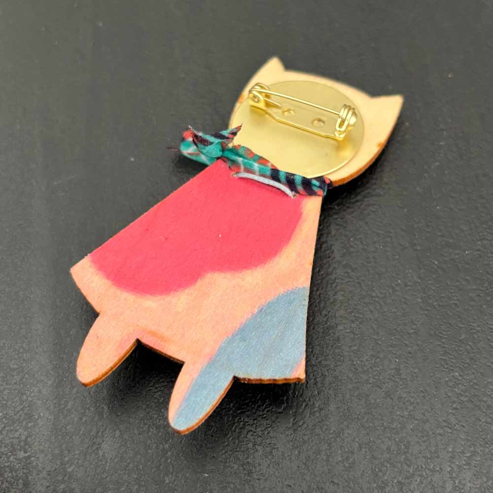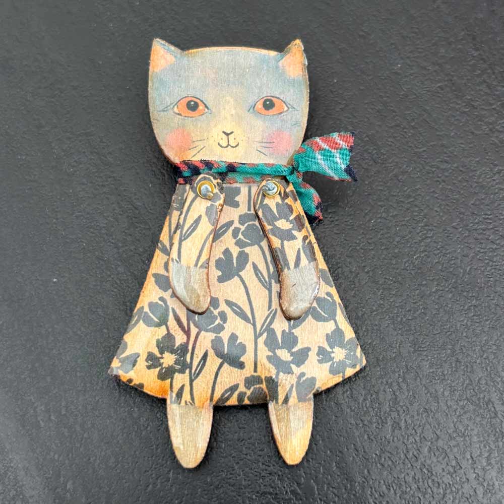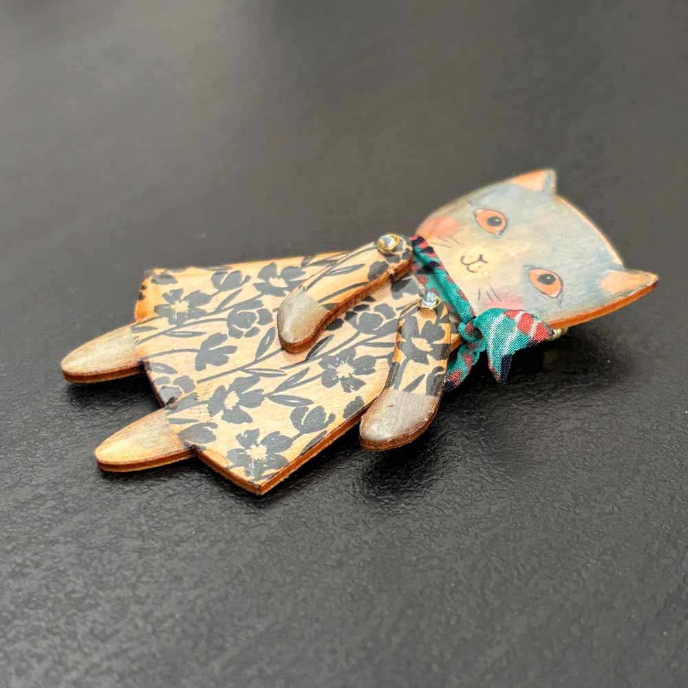 Spilla in legno smaltato a forma di bambola gattina certosina che indossa un vestito floreale e una sciarpina azzurra!!
