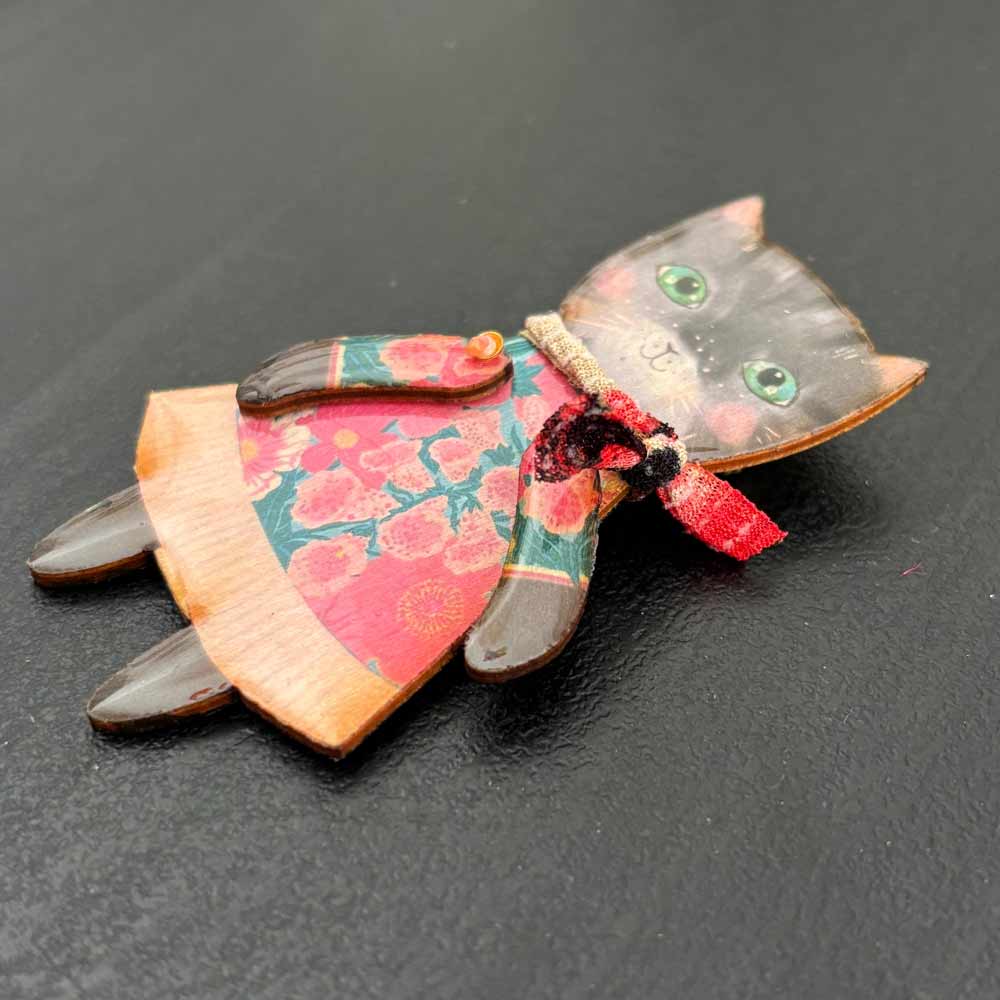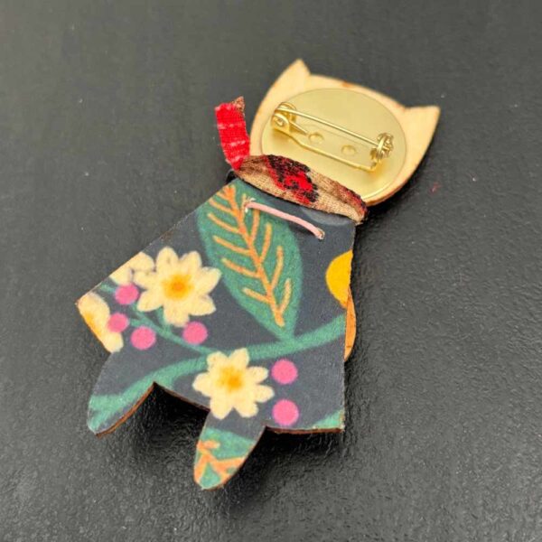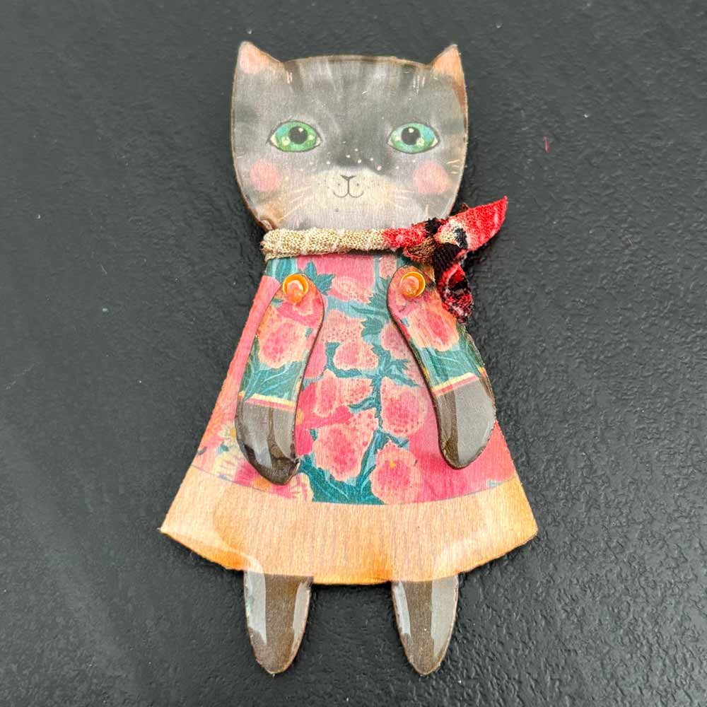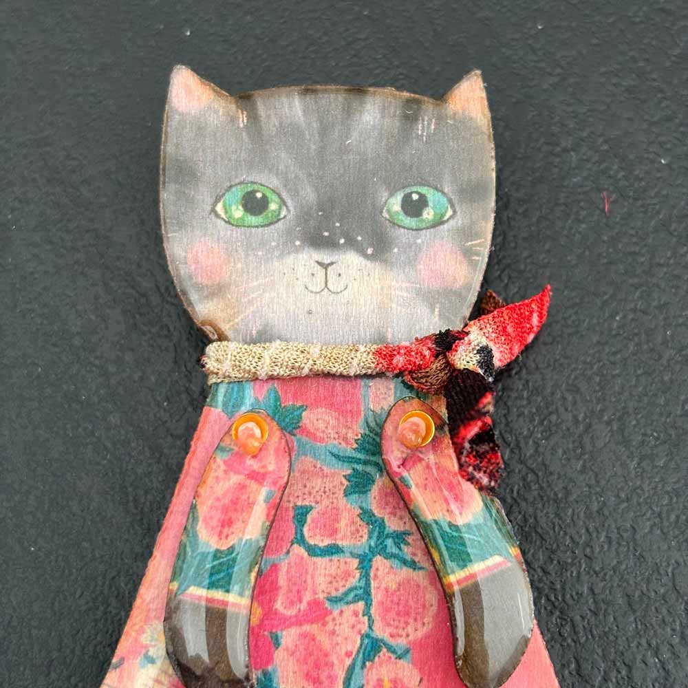 Spilla in legno smaltato a forma di bambola gattina grigia che indossa un vestito floreale e una sciarpina beige e rossa!!