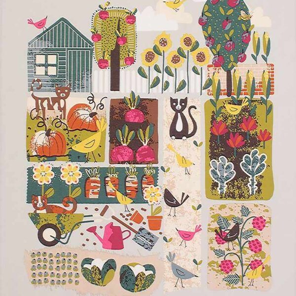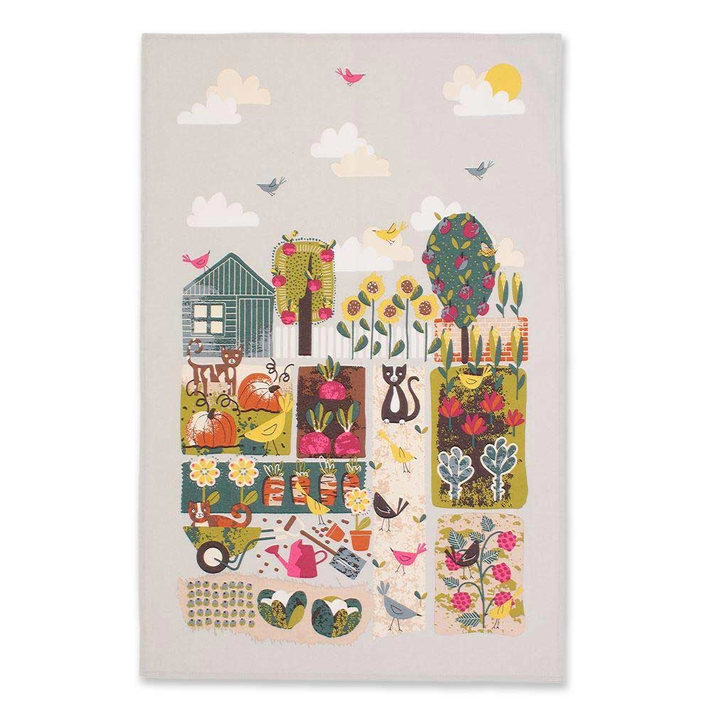 Strofinaccio da cucina in cotone con una bellissima illustrazioni di gatti e uccellini che si divertono nell’orto!!