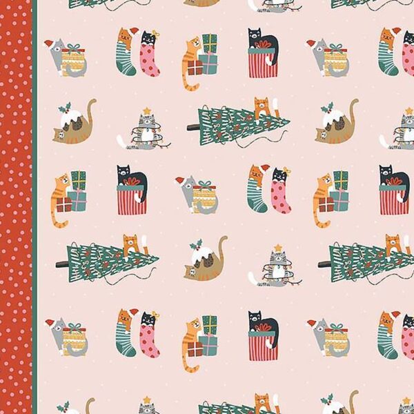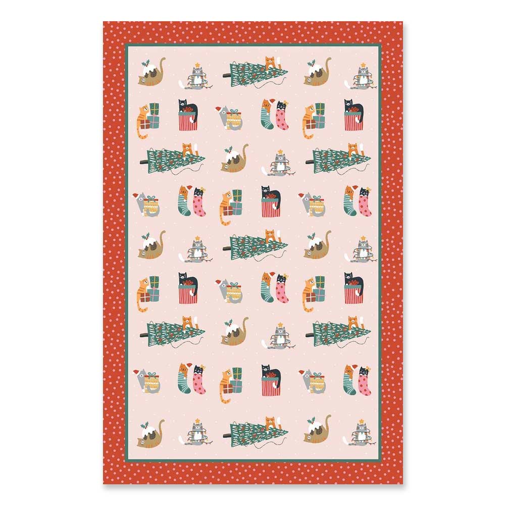 Strofinaccio da cucina in cotone bordato di rosso con tanti disegni di gattini natalizi alle prese con regali, alberi di Natale e tante altre cose festive!!