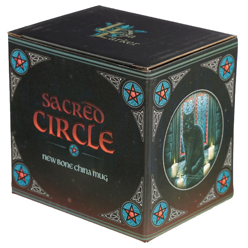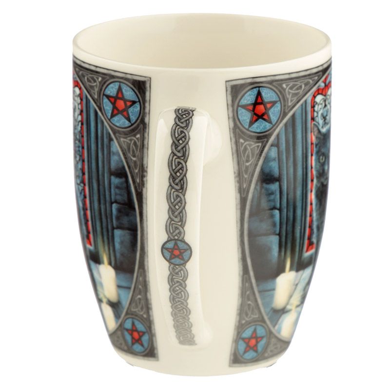 Tazza da caffellatte in ceramica decorata con un’illustrazione di un gatto “arcano” e pensoso in stile fantasy disegnata da Lisa Parker.