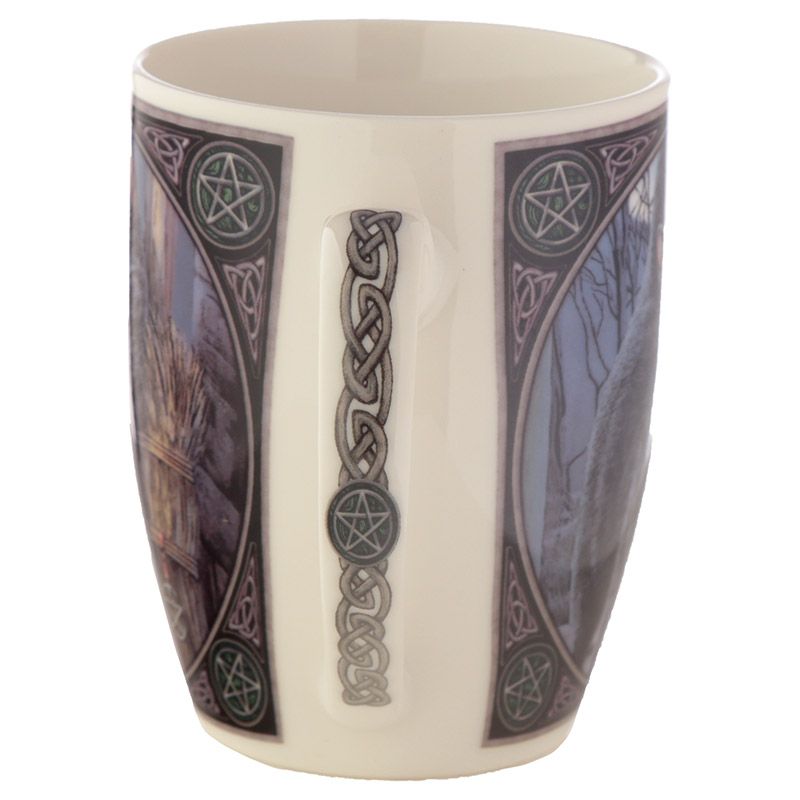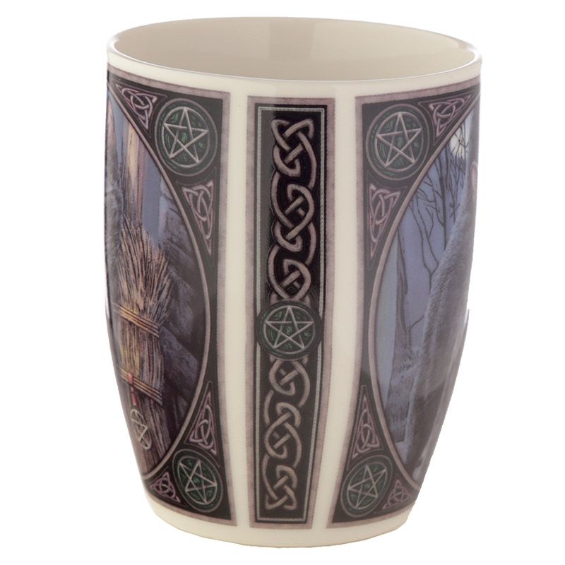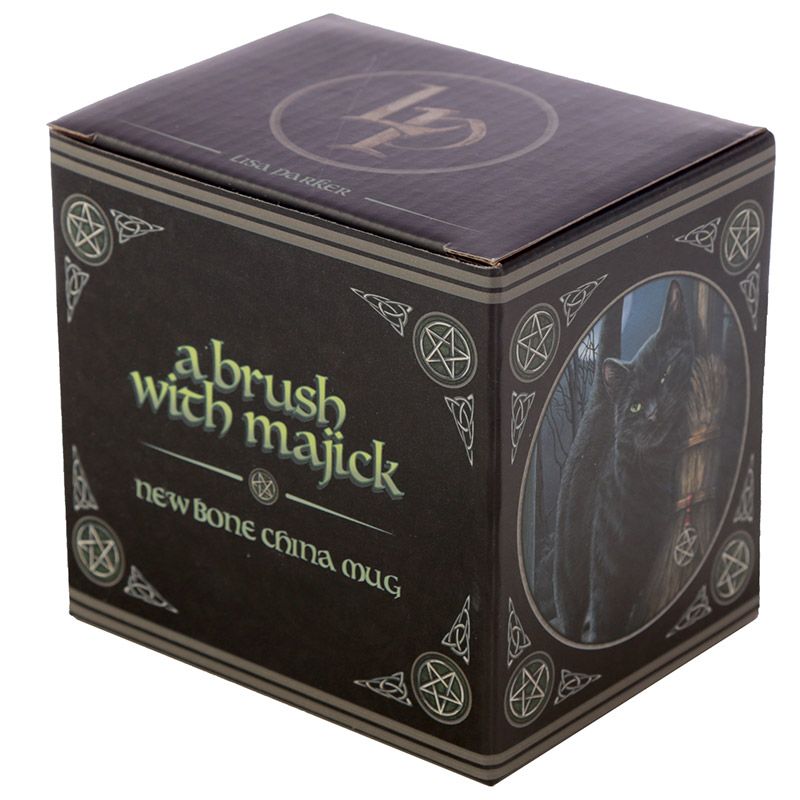 Tazza da caffellatte in ceramica decorata con un’illustrazione di un gatto nero di fianco a una scopa in stile fantasy disegnata da Lisa Parker.