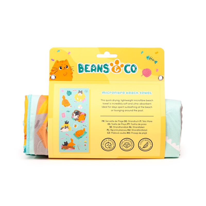Telo mare leggero in microfibra azzurro decorato con divertenti illustrazioni di gatti e gattini estivi! Super comodo e compatto, è facilissimo metterlo in valigia conservando un sacco di spazio!